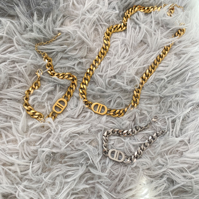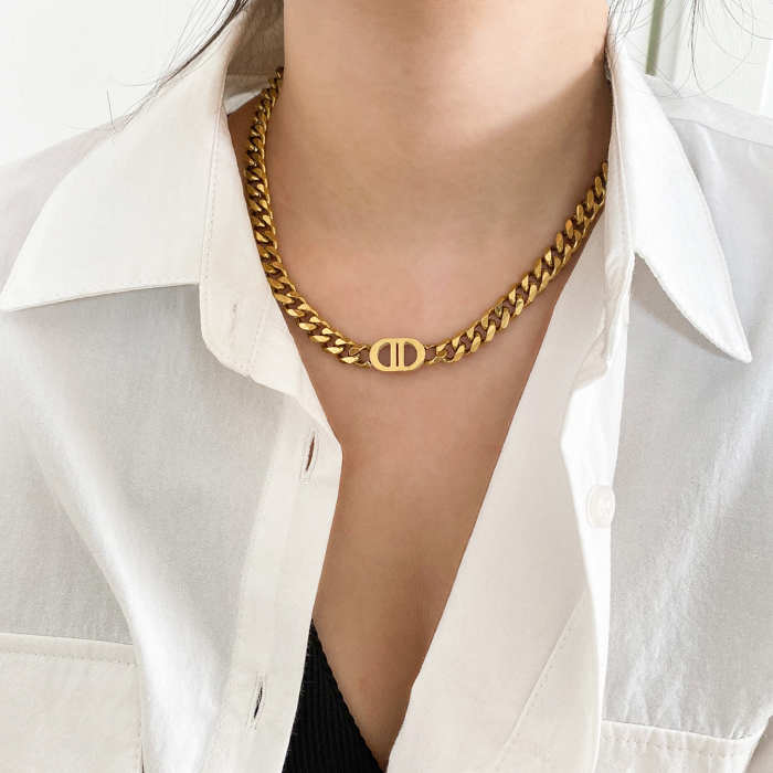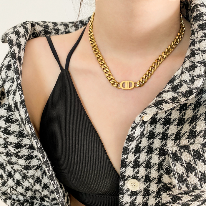 重工高品质粗链金色字母钛钢项链女欧美ins网红嘻哈短锁骨链手链